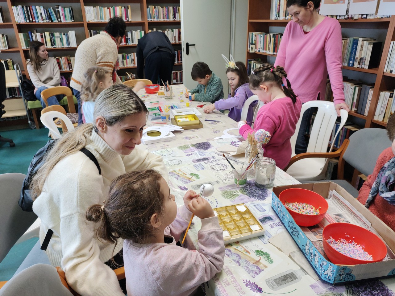 A Tiszaparti Fiókkönyvtár idén is megtelt élettel, nevetéssel és színes kavalkáddal, hiszen megrendezésre került a hagyományos húsvéti kézműves játszóház. A tavasz első napsugarai már az ablakon át is jókedvet hoztak, de a gyerekek lelkesedése tette igazán varázslatossá a délelőtött.