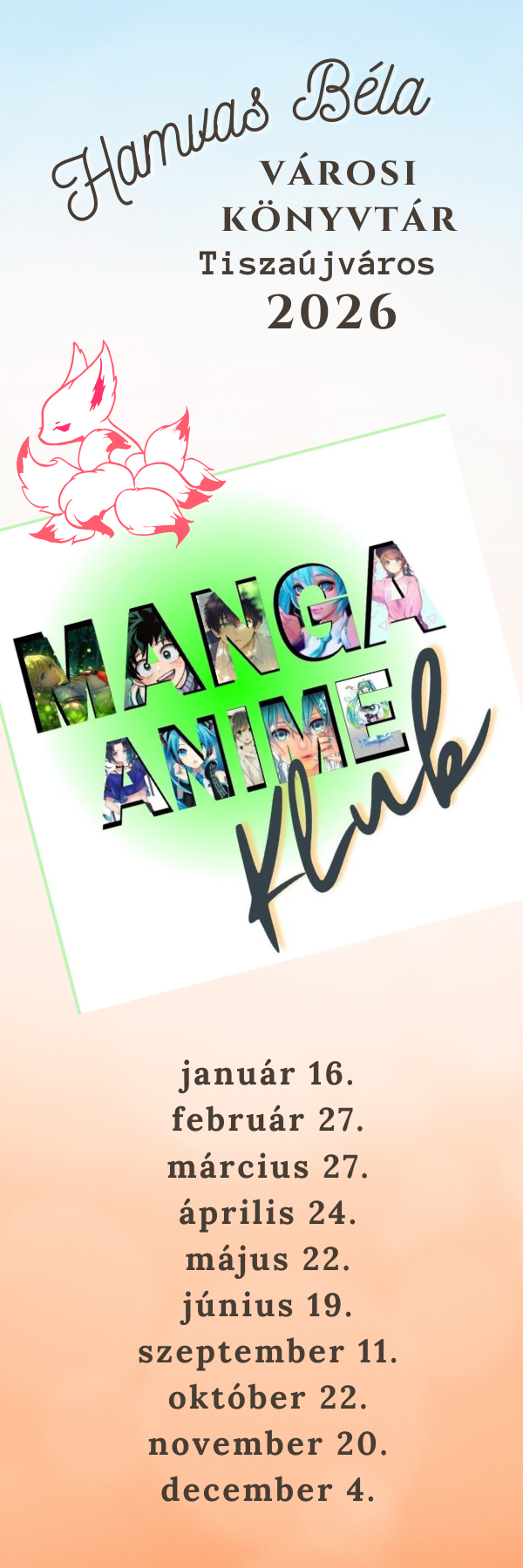Ha érdekel minden, ami manga és anime, itt a helyed! Ha szeretsz mangát olvasni és anime filmeket nézni, és szívesen beszélgetnél róluk manga rajzolás közben, itt megteheted ezt. Havonta egyszer tartandó klubfoglalkozásunkhoz már több japán manga és anime rajongó csatlakozott, gyere legyél te is klubtag.